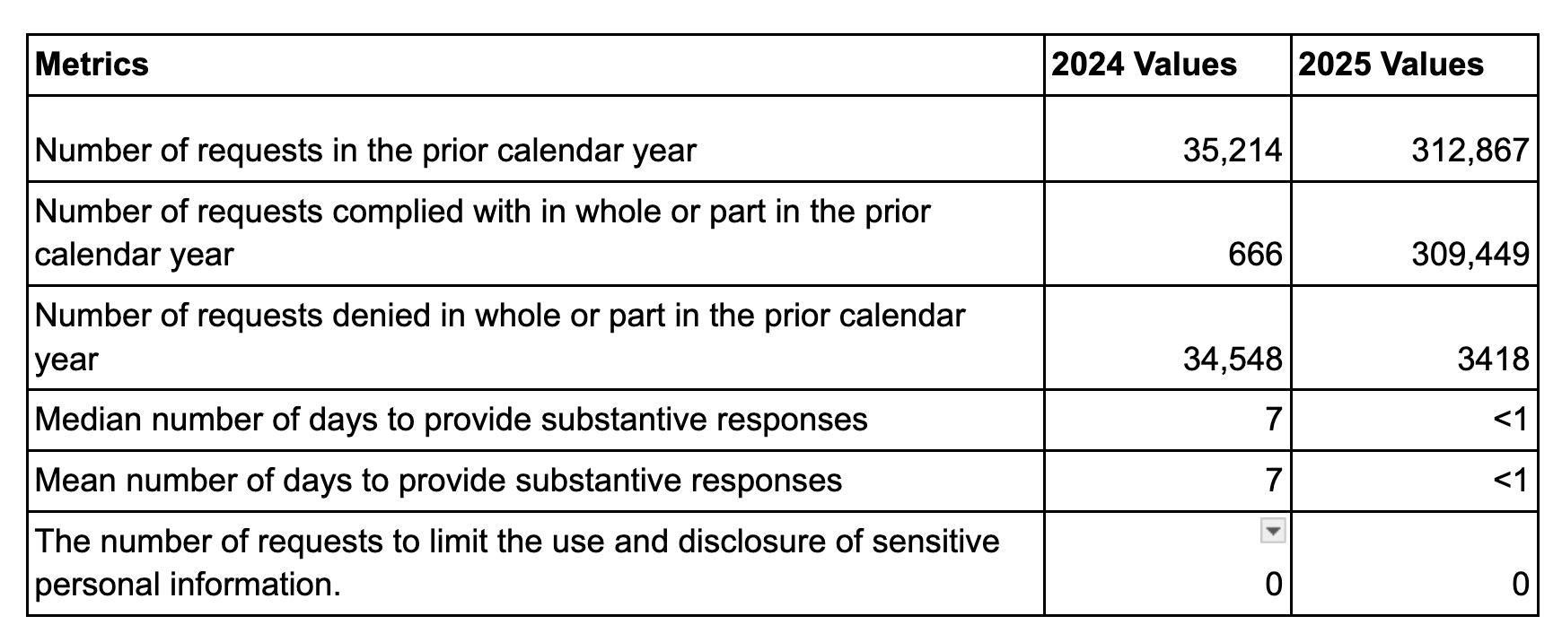 Rights Requests Metrics. Applicable California law requires that we annually provide you with metrics regarding the consumer data requests we have received and how we have processed them. This information is available in the following chart:
